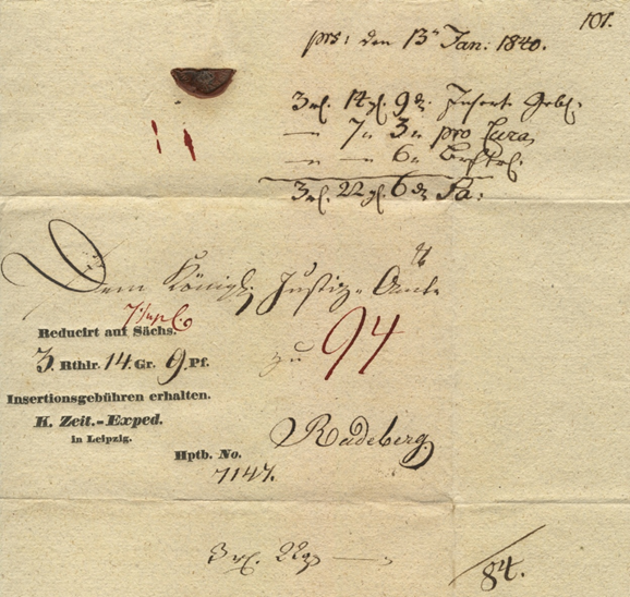 13. Januar 1840; Postvorschussbrief von Leipzig nach Radeberg; Vorschuss 3 Reichstaler 14 Gr. 9 Pf.; Währungsumstellung in Vereinstaler war bereits beschlossen; Umrechnung in die alte Währung erfolgte seitens der Post noch bis 31.12.1840; deshalb Vermerk „Reduciert auf Sächs. 3 Rthlr. 14 Gr. 9 Pf.“; Procuragebühr 7¼ Gr. alte Währung; gesamt 94 Gr. (3 (Rthlr.) x 24 Gr. + 14 Gr. + (9 Pf.) ¾ Gr.+ 7¼ Gr. (Procuragebühr)); die 94 Gr. entsprachen den vermerkten 3 Talern 22 Groschen am unteren Rand; oben rechts ebenfalls noch Gesamtberechnung nach alter Währung vom Empfänger, zuzüglich des Bestellgeldes von 6 Pf.; die Königliche Zeitungsexpedition Leipzig war vom Porto befreit.